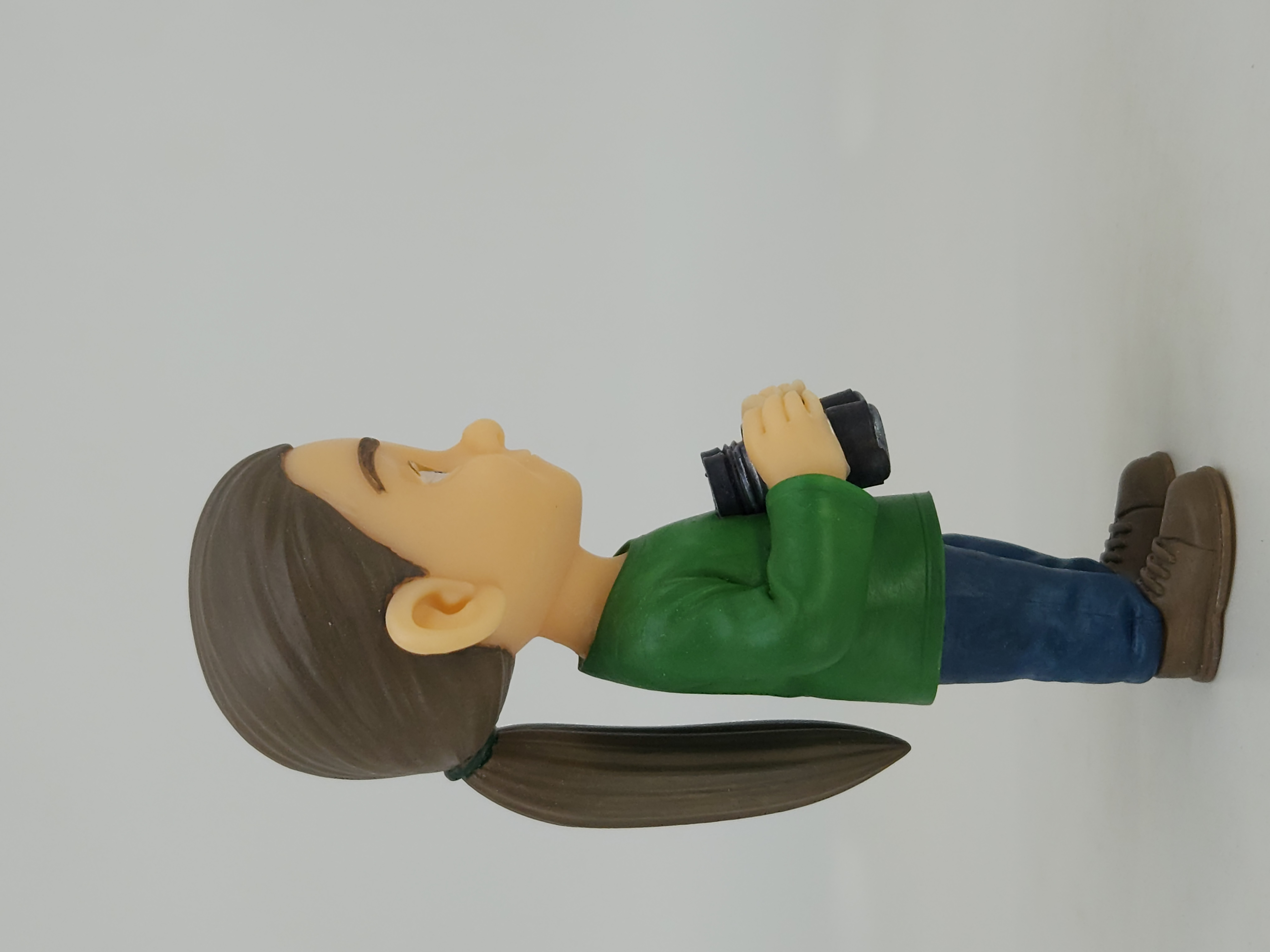 Ele foi retratado exatamente como costuma acompanhá-los em campo: de botas, calça jeans e camiseta de manga comprida, segurando seu binóculo para não perder nenhum detalhe da natureza.